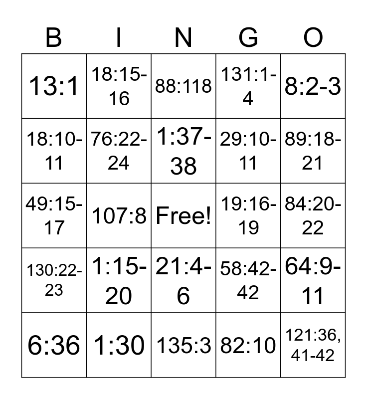 This bingo card has a free space and 24 words: 1:15-20, 1:30, 1:37-38, 6:36, 8:2-3, 13:1, 18:10-11, 18:15-16, 19:16-19, 21:4-6, 29:10-11, 49:15-17, 58:42-42, 64:9-11, 76:22-24, 82:10, 84:20-22, 88:118, 89:18-21, 107:8, 121:36, 41-42, 130:22-23, 131:1-4 and 135:3.
