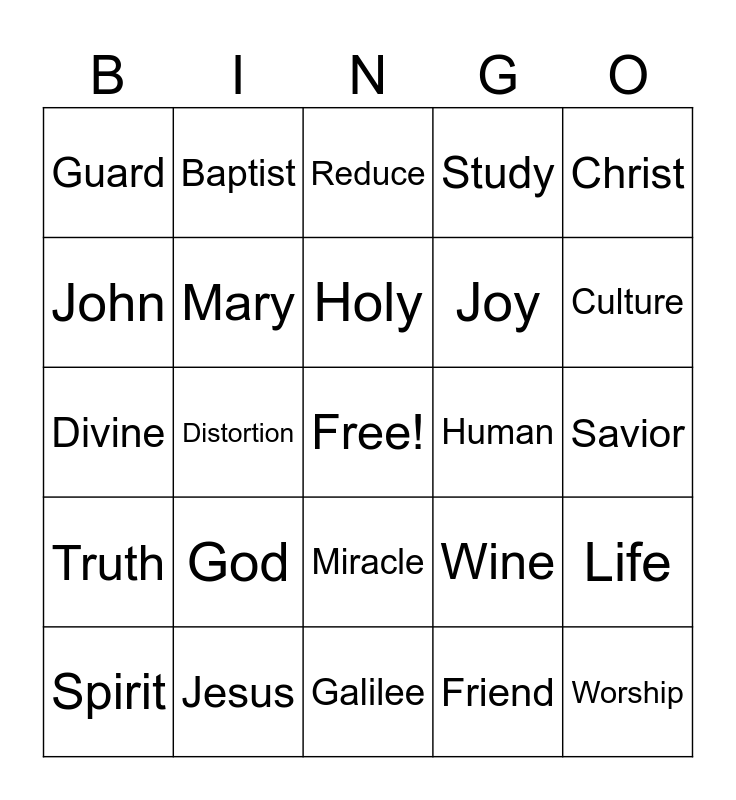 This bingo card has a free space and 24 words: God, Jesus, Holy, Spirit, Christ, Guard, John, Baptist, Human, Miracle, Joy, Divine, Wine, Life, Mary, Friend, Savior, Reduce, Culture, Distortion, Worship, Truth, Study and Galilee.
