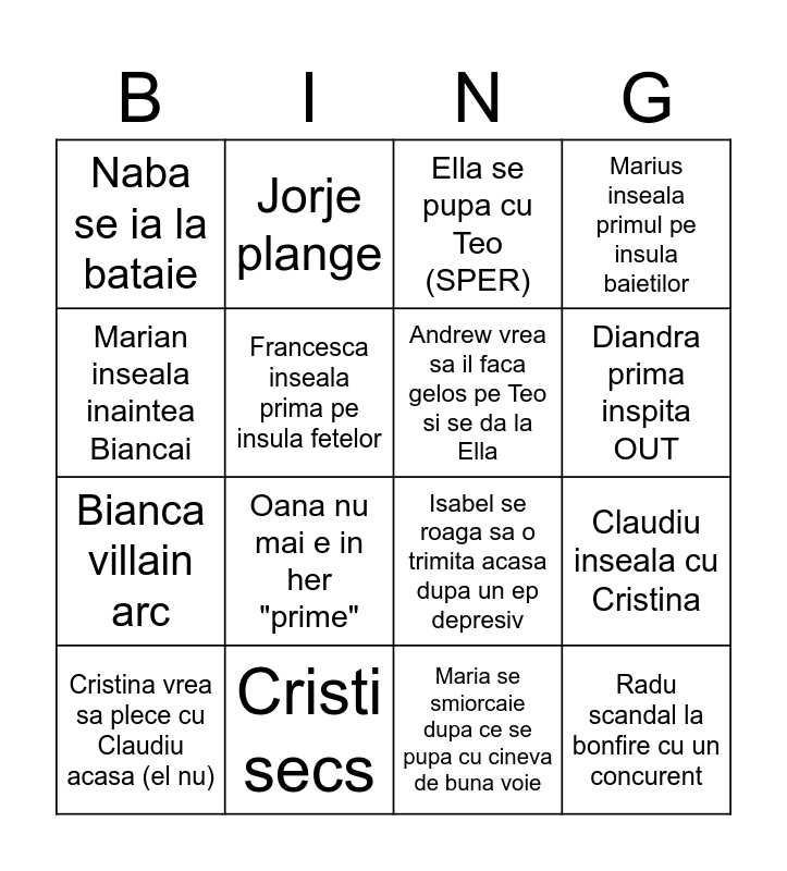 This bingo card has 16 words: Cristi secs, Claudiu inseala cu Cristina, Ella se pupa cu Teo (SPER), Naba se ia la bataie, Bianca villain arc, Jorje plange, Isabel se roaga sa o trimita acasa dupa un ep depresiv, Maria se smiorcaie dupa ce se pupa cu cineva de buna voie, Marian inseala inaintea Biancai, Francesca inseala prima pe insula fetelor, Cristina vrea sa plece cu Claudiu acasa (el nu), Marius inseala primul pe insula baietilor, Oana nu mai e in her "prime", Diandra prima inspita OUT, Andrew vrea sa il faca gelos pe Teo si se da la Ella and Radu scandal la bonfire cu un concurent.