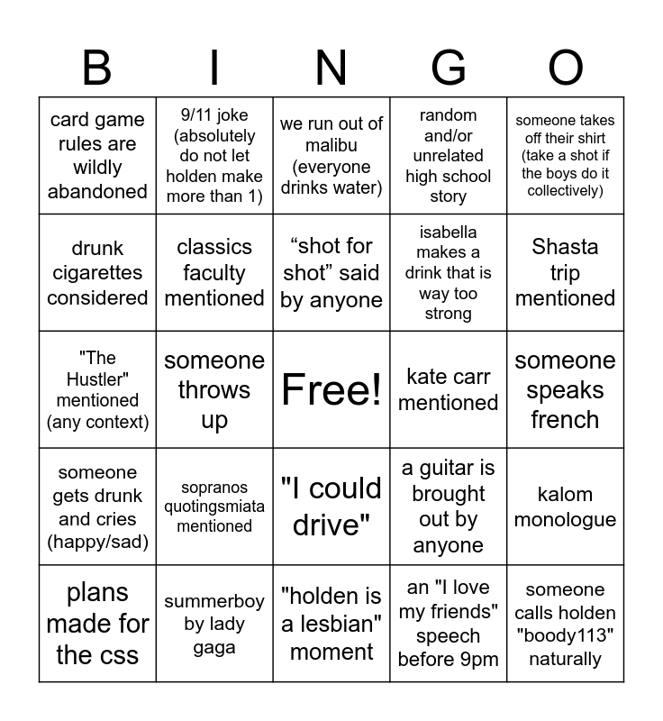 This bingo card has a free space and 38 words: "you gotta be right next to me, you gotta be RIGHT next to me", someone speaks greek/latin, brynn passionately asks for ice, classics faculty mentioned, kalom monologue, sopranos quotingsmiata mentioned, “shot for shot” said by anyone, drunk ella holds an earnest conversation with someone she just met, someone takes off their shirt (take a shot if the boys do it collectively), isabella makes a drink that is way too strong, someone throws up, random and/or unrelated high school story, someone calls holden "boody113" naturally, someone speaks french, drunk cigarettes considered, someone gets drunk and cries (happy/sad), homoerotic moment, we run out of malibu (everyone drinks water), caeden and dylan share a special moment, kate carr mentioned, card game rules are wildly abandoned, summerboy by lady gaga, Shasta trip mentioned, plans made for the css, "as a matter of fact" -mcpherson, "holden is a lesbian" moment, meztli moment (open to interpretation), LinkedIn, holden does something TOTALLY neurotypical, someone spills a lot of alcohol, someone meows, and then 3+ others meow in response, "I could drive", an "I love my friends" speech before 9pm, 9/11 joke (absolutely do not let holden make more than 1), arrested development mentioned, a guitar is brought out by anyone, "The Hustler" mentioned (any context) and an "I love my friends" speech after 9pm.