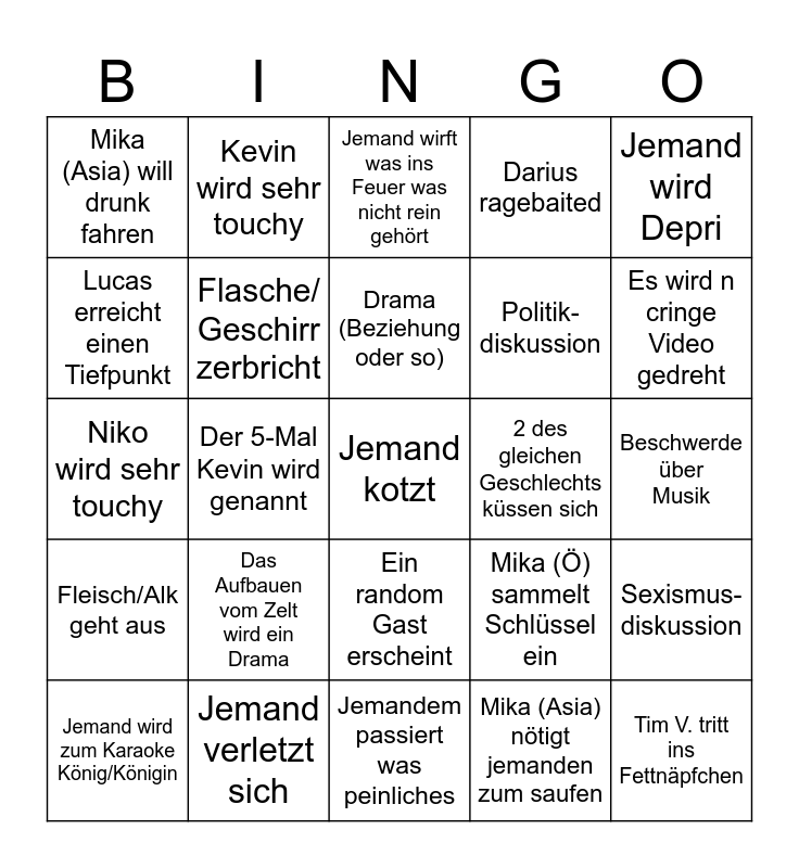 This bingo card has a free space and 24 words: Das Aufbauen vom Zelt wird ein Drama, Jemand verletzt sich, Drama (Beziehung oder so), Jemand wird zum Karaoke König/Königin, Jemand wird Depri, Mika (Asia) will drunk fahren, Lucas erreicht einen Tiefpunkt, Kevin wird sehr touchy, 2 des gleichen Geschlechts küssen sich, Ein random Gast erscheint, Politik-diskussion, Niko wird sehr touchy, Mika (Ö) sammelt Schlüssel ein, Sexismus-diskussion, Flasche/ Geschirr zerbricht, Mika (Asia) nötigt jemanden zum saufen, Beschwerde über Musik, Jemand wirft was ins Feuer was nicht rein gehört, Es wird n cringe Video gedreht, Der 5-Mal Kevin wird genannt, Tim V. tritt ins Fettnäpfchen, Fleisch/Alk geht aus, Darius ragebaited and Jemandem passiert was peinliches.