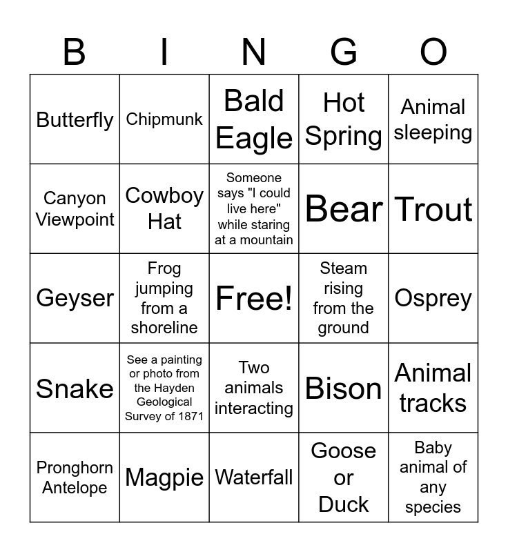 This bingo card has a free space and 27 words: Bison, Elk, Bear, Waterfall, Canyon Viewpoint, Bald Eagle, Chipmunk, Snake, Steam rising from the ground, Animal tracks, Geyser, Hot Spring, Pronghorn Antelope, Magpie, Trout, Spot a tourist doing something questionable near wildlife, Cowboy Hat, Someone says "I could live here" while staring at a mountain, See a painting or photo from the Hayden Geological Survey of 1871, Butterfly, Osprey, Goose or Duck, Frog jumping from a shoreline, Baby animal of any species, Two animals interacting, Animal sleeping and Bluebird.