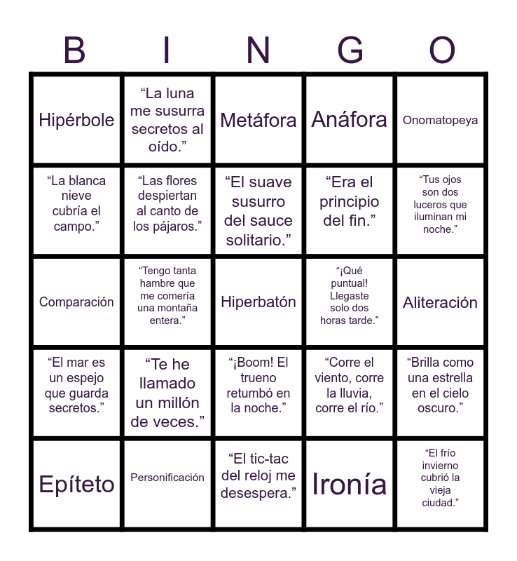 This bingo card has a free space and 24 words: Epíteto, “Te he llamado un millón de veces.”, “El suave susurro del sauce solitario.”, Ironía, Onomatopeya, Hipérbole, “La luna me susurra secretos al oído.”, Metáfora, “¡Qué puntual! Llegaste solo dos horas tarde.”, Aliteración, Comparación, “Las flores despiertan al canto de los pájaros.”, “Corre el viento, corre la lluvia, corre el río.”, “Brilla como una estrella en el cielo oscuro.”, “La blanca nieve cubría el campo.”, Personificación, “El tic-tac del reloj me desespera.”, Anáfora, “Tus ojos son dos luceros que iluminan mi noche.”, “El mar es un espejo que guarda secretos.”, “Tengo tanta hambre que me comería una montaña entera.”, “¡Boom! El trueno retumbó en la noche.”, “Era el principio del fin.” and “El frío invierno cubrió la vieja ciudad.”.