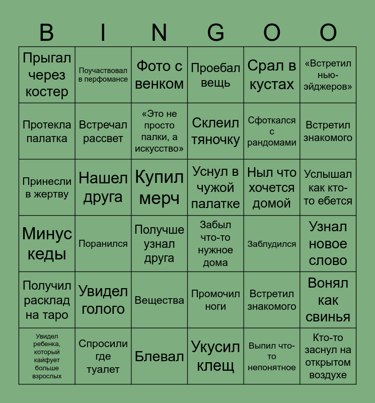 This bingo card has 36 words: Промочил ноги, Вещества, Укусил клещ, Протекла палатка, Минус кеды, Уснул в чужой палатке, Встречал рассвет, Блевал, Срал в кустах, Встретил знакомого, Встретил знакомого, Проебал вещь, Вонял как свинья, Нашел друга, Склеил тяночку, Прыгал через костер, Получил расклад на таро, Ныл что хочется домой, Принесли в жертву, Фото с венком, Купил мерч, Поранился, Забыл что-то нужное дома, Получше узнал друга, Заблудился, Поучаствовал в перфомансе, Сфоткался с рандомами, Спросили где туалет, «Это не просто палки, а искусство», «Встретил нью-эйджеров», Кто-то заснул на открытом воздухе, Увидел ребенка, который кайфует больше взрослых, Узнал новое слово, Услышал как кто-то ебется, Увидел голого and Выпил что-то непонятное.