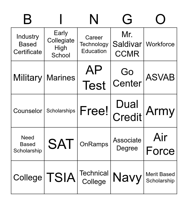 This bingo card has a free space and 24 words: SAT, TSIA, AP Test, College, Workforce, Industry Based Certificate, Military, Early Collegiate High School, Dual Credit, OnRamps, Go Center, Counselor, Associate Degree, Air Force, Marines, Navy, Army, Career Technology Education, ASVAB, Scholarships, Merit Based Scholarship, Need Based Scholarship, Mr. Saldivar CCMR and Technical College.