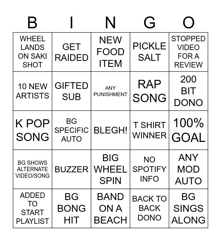 This bingo card has a free space and 24 words: BUZZER, BG BONG HIT, ANY PUNISHMENT, ADDED TO START PLAYLIST, STOPPED VIDEO FOR A REVIEW, WHEEL LANDS ON SAKI SHOT, 10 NEW ARTISTS, GET RAIDED, T SHIRT WINNER, BIG WHEEL SPIN, RAP SONG, K POP SONG, NO SPOTIFY INFO, ANY MOD AUTO, GIFTED SUB, BACK TO BACK DONO, 100% GOAL, NEW FOOD ITEM, 200 BIT DONO, BG SPECIFIC AUTO, BG SINGS ALONG, BG SHOWS ALTERNATE VIDEO/SONG, PICKLE SALT and BAND ON A BEACH.