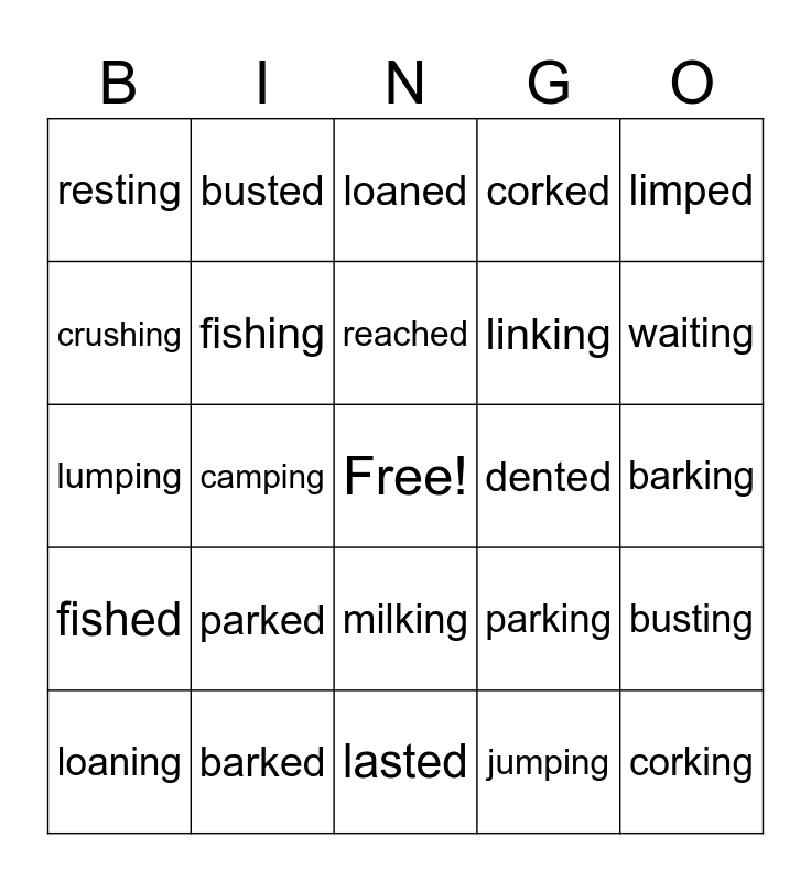 This bingo card has a free space and 32 words: jumping, jumped, camping, camped, fished, fishing, limped, busting, busted, peaked, reached, loaned, lumped, milked, dented, ranting, loaning, lumping, milking, parked, parking, ranted, barking, barked, corking, corked, linking, crushing, resting, lasted, lasting and waiting.