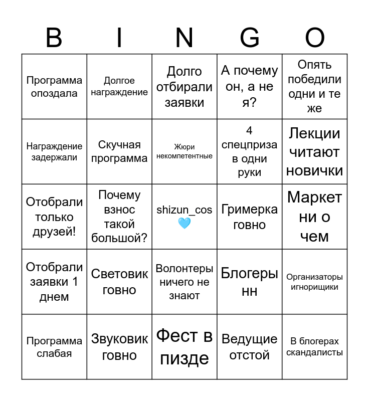 This bingo card has a free space and 24 words: Световик говно, Звуковик говно, Жюри некомпетентные, Программа слабая, Опять победили одни и те же, Программа опоздала, Награждение задержали, Долгое награждение, Гримерка говно, Волонтеры ничего не знают, 4 спецприза в одни руки, Отобрали только друзей!, Блогеры нн, Организаторы игнорищики, Скучная программа, Ведущие отстой, Маркет ни о чем, Долго отбирали заявки, Лекции читают новички, Почему взнос такой большой?, В блогерах скандалисты, Отобрали заявки 1 днем, А почему он, а не я? and Фест в пизде.