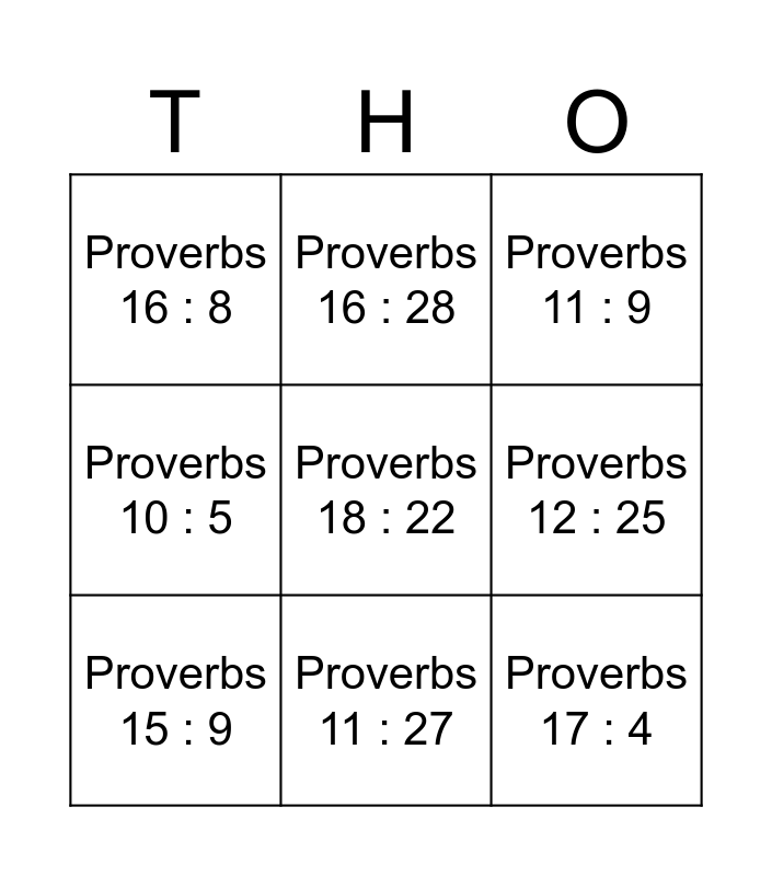 This bingo card has 116 words: Free!, Proverbs 1 : 8, Proverbs 4 : 18, Proverbs 6 : 6, Proverbs 10 : 22, Proverbs 10 : 1, Proverbs 10 : 5, Proverbs 10 : 10, Proverbs 10 : 12, Proverbs 10 : 14, Proverbs 10 : 16, Proverbs 10 : 19, Proverbs 10 : 20, Proverbs 10 : 26, Proverbs 10 : 28, Proverbs 10 : 32, Proverbs 11 : 1, Proverbs 11 : 2, Proverbs 11 : 3, Proverbs 11 : 5, Proverbs 11 : 7, Proverbs 11 : 9, Proverbs 11 : 11, Proverbs 11 : 12, Proverbs 11 : 13, Proverbs 11 : 14, Proverbs 11 : 18, Proverbs 11 : 20, Proverbs 11 : 21, Proverbs 11 : 25, Proverbs 11 : 26, Proverbs 11 : 27, Proverbs 11 : 30, Proverbs 12 : 1, Proverbs 12 : 2, Proverbs 12 : 3, Proverbs 12 : 6, Proverbs 12 : 7, Proverbs 12 : 10, Proverbs 12 : 12, Proverbs 12 : 13, Proverbs 12 : 14, Proverbs 12 : 15, Proverbs 12 : 16, Proverbs 12 : 18, Proverbs 12 : 19, Proverbs 12 : 22, Proverbs 12 : 25, Proverbs 12 : 28, Proverbs 13 : 1, Proverbs 13 : 2, Proverbs 13 : 6, Proverbs 13 : 10, Proverbs 13 : 20, Proverbs 13 : 21, Proverbs 13 : 24, Proverbs 14 : 2, Proverbs 14 : 6, Proverbs 14 : 11, Proverbs 14 : 20, Proverbs 14 : 29, Proverbs 14 : 30, Proverbs 14 : 31, Proverbs 15 : 1, Proverbs 15 : 2, Proverbs 15 : 5, Proverbs 15 : 8, Proverbs 15 : 9, Proverbs 15 : 17, Proverbs 15 : 18, Proverbs 15 : 30, Proverbs 15 : 31, Proverbs 15 : 33, Proverbs 16 : 1, Proverbs 16 : 2, Proverbs 16 : 3, Proverbs 16 : 6, Proverbs 16 : 8, Proverbs 16 : 9, Proverbs 16 : 16, Proverbs 16 : 24, Proverbs 16 : 28, Proverbs 16 : 31, Proverbs 16 : 33, Proverbs 17 : 4, Proverbs 17 : 5, Proverbs 17 : 9, Proverbs 17 : 14, Proverbs 17 : 17, Proverbs 17 : 28, Proverbs 18 : 10, Proverbs 18 : 12, Proverbs 18 : 13, Proverbs 18 : 14, Proverbs 18 : 22, Proverbs 19 : 13, Proverbs 19 : 18, Proverbs 19 : 19, Proverbs 19 : 21, Proverbs 19 : 27, Proverbs 20 : 3, Proverbs 20 : 4, Proverbs 20 : 10, Proverbs 20 : 22, Proverbs 20 : 29, Proverbs 21 : 2, Proverbs 21 : 3, Proverbs 21 : 9, Proverbs 21 : 12, Proverbs 21 : 13, Proverbs 22 : 1, Proverbs 22 : 2, Proverbs 22 : 3, Proverbs 22 : 6, Proverbs 22 : 9 and Proverbs 28 : 13.