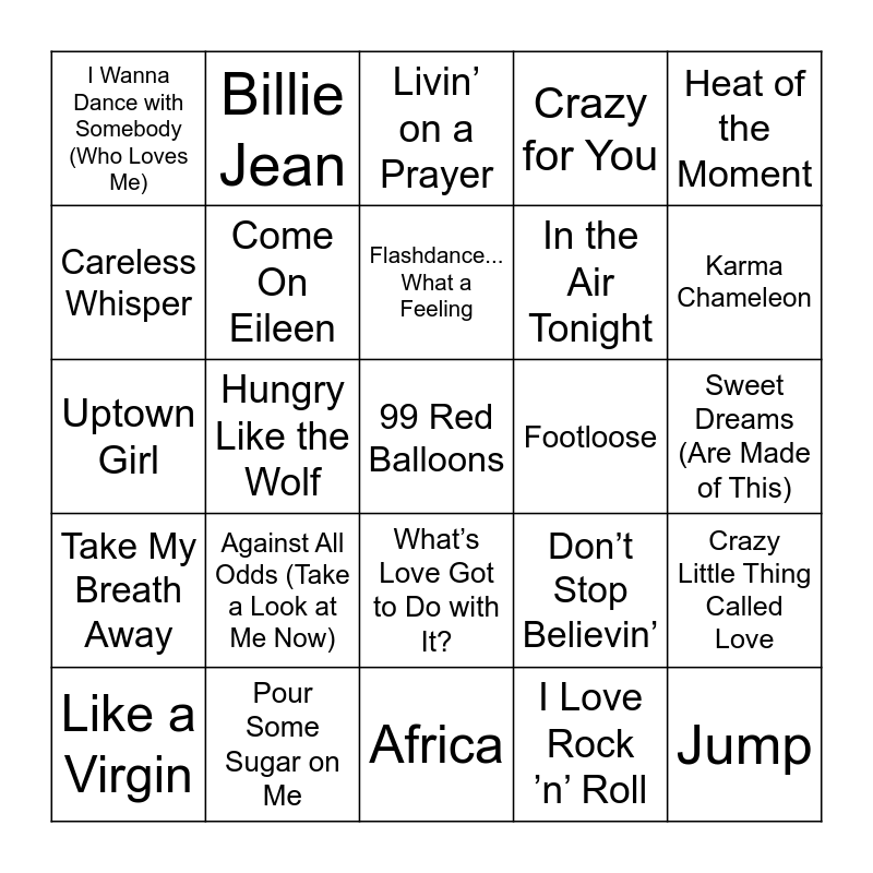 This bingo card has 51 words: FREE SPACE, 99 Red Balloons, Abracadabra, Africa, Against All Odds (Take a Look at Me Now), Another One Bites the Dust, Billie Jean, Bette Davis Eyes, Careless Whisper, Celebration, Come On Eileen, Crazy for You, Crazy Little Thing Called Love, Don’t Stop Believin’, Down Under, Eye of the Tiger, Flashdance... What a Feeling, Footloose, Girls Just Want to Have Fun, Heat of the Moment, Hungry Like the Wolf, I Love Rock ’n’ Roll, I Wanna Dance with Somebody (Who Loves Me), In the Air Tonight, Jack & Diane, Jump, Karma Chameleon, Kiss, Like a Virgin, Livin’ on a Prayer, Maniac, Material Girl, Modern Love, Never Gonna Give You Up, Physical, Pour Some Sugar on Me, Private Eyes, Relax, Shout, Sweet Child o’ Mine, Sweet Dreams (Are Made of This), Take My Breath Away, Take On Me, Time After Time, Total Eclipse of the Heart, Under Pressure, Uptown Girl, Wake Me Up Before You Go-Go, Walk Like an Egyptian, What’s Love Got to Do with It? and With or Without You.