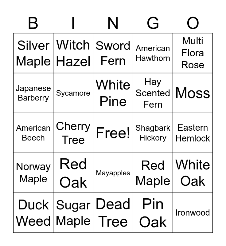This bingo card has a free space and 24 words: Red Oak, Sugar Maple, White Pine, Duck Weed, Multi Flora Rose, Silver Maple, Japanese Barberry, Witch Hazel, Shagbark Hickory, Mayapples, Hay Scented Fern, American Beech, Red Maple, White Oak, Sycamore, Pin Oak, Eastern Hemlock, Sword Fern, Moss, Cherry Tree, Ironwood, Norway Maple, American Hawthorn and Dead Tree.