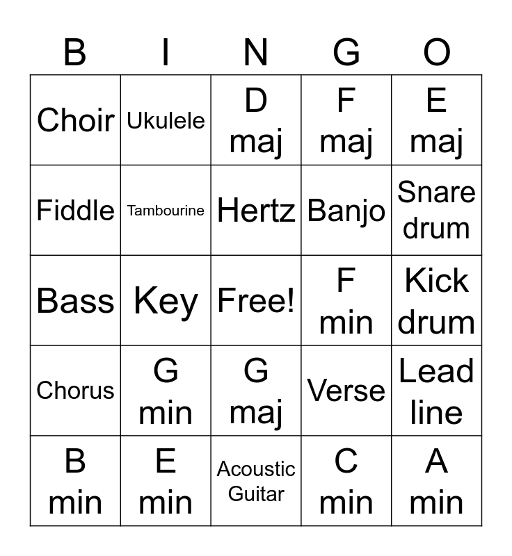 This bingo card has a free space and 44 words: A maj, A min, B maj, B min, C maj, C min, D maj, D min, E maj, E min, F maj, F min, G maj, G min, Violin, Acoustic Guitar, Electric Guitar, Bass, Maracas, Snare drum, Ukulele, Harmony, Rhythm, Choir, Piano, Kick drum, Cymbals, Melody, Verse, Chorus, Chord, Lead line, Sing, Sound waves, Key, Scale, Pitch, Tempo, Hertz, Fiddle, Banjo, Harmonica, Tambourine and Congas.