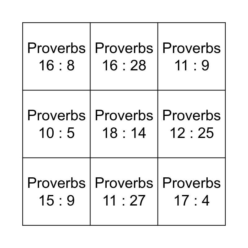 This bingo card has 114 words: Proverbs 28 : 13, Proverbs 1 : 8, Proverbs 4 : 18, Proverbs 6 : 6, Proverbs 10 : 22, Proverbs 10 : 1, Proverbs 10 : 5, Proverbs 10 : 10, Proverbs 10 : 12, Proverbs 10 : 14, Proverbs 10 : 16, Proverbs 10 : 19, Proverbs 10 : 20, Proverbs 10 : 26, Proverbs 10 : 28, Proverbs 10 : 32, Proverbs 11 : 1, Proverbs 11 : 2, Proverbs 11 : 3, Proverbs 11 : 5, Proverbs 11 : 7, Proverbs 11 : 9, Proverbs 11 : 11, Proverbs 11 : 12, Proverbs 11 : 13, Proverbs 11 : 14, Proverbs 11 : 18, Proverbs 11 : 20, Proverbs 11 : 21, Proverbs 11 : 25, Proverbs 11 : 26, Proverbs 11 : 27, Proverbs 11 : 30, Proverbs 12 : 1, Proverbs 12 : 2, Proverbs 12 : 3, Proverbs 12 : 6, Proverbs 12 : 7, Proverbs 12 : 10, Proverbs 12 : 12, Proverbs 12 : 13, Proverbs 12 : 14, Proverbs 12 : 15, Proverbs 12 : 16, Proverbs 12 : 18, Proverbs 12 : 19, Proverbs 12 : 22, Proverbs 12 : 25, Proverbs 12 : 28, Proverbs 13 : 1, Proverbs 13 : 2, Proverbs 13 : 6, Proverbs 13 : 10, Proverbs 13 : 20, Proverbs 13 : 21, Proverbs 13 : 24, Proverbs 14 : 2, Proverbs 14 : 6, Proverbs 14 : 11, Proverbs 14 : 20, Proverbs 14 : 29, Proverbs 14 : 30, Proverbs 14 : 31, Proverbs 15 : 1, Proverbs 15 : 2, Proverbs 15 : 5, Proverbs 15 : 8, Proverbs 15 : 9, Proverbs 15 : 17, Proverbs 15 : 18, Proverbs 15 : 30, Proverbs 15 : 31, Proverbs 15 : 33, Proverbs 16 : 1, Proverbs 16 : 2, Proverbs 16 : 3, Proverbs 16 : 6, Proverbs 16 : 8, Proverbs 16 : 9, Proverbs 16 : 16, Proverbs 16 : 24, Proverbs 16 : 28, Proverbs 16 : 31, Proverbs 16 : 33, Proverbs 17 : 4, Proverbs 17 : 5, Proverbs 17 : 9, Proverbs 17 : 14, Proverbs 17 : 17, Proverbs 17 : 28, Proverbs 18 : 10, Proverbs 18 : 12, Proverbs 18 : 13, Proverbs 18 : 14, Proverbs 18 : 22, Proverbs 19 : 18, Proverbs 19 : 19, Proverbs 19 : 21, Proverbs 19 : 27, Proverbs 20 : 3, Proverbs 20 : 4, Proverbs 20 : 10, Proverbs 20 : 22, Proverbs 20 : 29, Proverbs 21 : 2, Proverbs 21 : 3, Proverbs 21 : 9, Proverbs 21 : 12, Proverbs 21 : 13, Proverbs 22 : 1, Proverbs 22 : 2, Proverbs 22 : 3, Proverbs 22 : 6 and Proverbs 22 : 9.