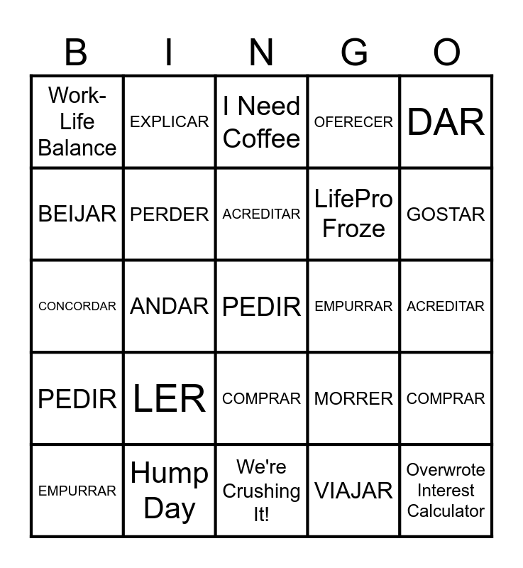 This bingo card has a free space and 39 words: LER, VIAJAR, OFERECER, MORRER, COMPRAR, PEDIR, ANDAR, DEPENDER, EMPURRAR, ACREDITAR, BEIJAR, EXPLICAR, SORRIR, GOSTAR, CONCORDAR, LER, COMPRAR, OFERECER, MORRER, EMPURRAR, PERDER, ACREDITAR, VIAJAR, DAR, Casual Friday!, Hump Day, We're Crushing It!, Down Load, Up Load, Work-Life Balance, ACT, OnBase Kickout, LifePro Froze, Overwrote Interest Calculator, E-Mail is Not Responding, Submit an IT Ticket, I Need Coffee, Biggest Loser and File Migration.