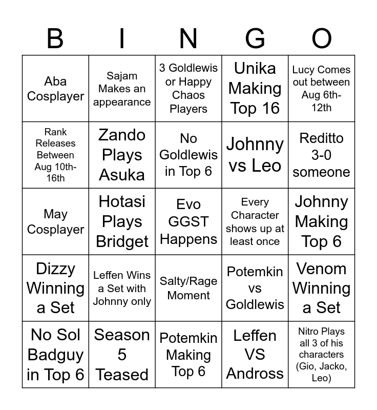 This bingo card has a free space and 24 words: Leffen Wins a Set with Johnny only, Season 5 Teased, No Goldlewis in Top 6, No Sol Badguy in Top 6, Lucy Comes out between Aug 6th-12th, Aba Cosplayer, Rank Releases Between Aug 10th-16th, Sajam Makes an appearance, Every Character shows up at least once, Salty/Rage Moment, Johnny vs Leo, May Cosplayer, Potemkin vs Goldlewis, Venom Winning a Set, Zando Plays Asuka, Leffen VS Andross, Johnny Making Top 6, 3 Goldlewis or Happy Chaos Players, Reditto 3-0 someone, Hotasi Plays Bridget, Nitro Plays all 3 of his characters (Gio, Jacko, Leo), Dizzy Winning a Set, Unika Making Top 16 and Potemkin Making Top 6.