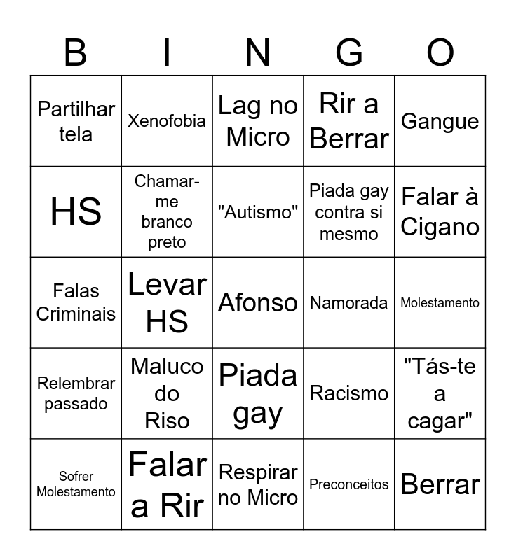 This bingo card has a free space and 24 words: Maluco do Riso, Falar a Rir, "Autismo", Sofrer Molestamento, Gangue, Partilhar tela, HS, Xenofobia, Namorada, Piada gay, Piada gay contra si mesmo, Falas Criminais, Racismo, "Tás-te a cagar", Chamar-me branco preto, Preconceitos, Molestamento, Lag no Micro, Falar à Cigano, Levar HS, Berrar, Relembrar passado, Rir a Berrar and Respirar no Micro.