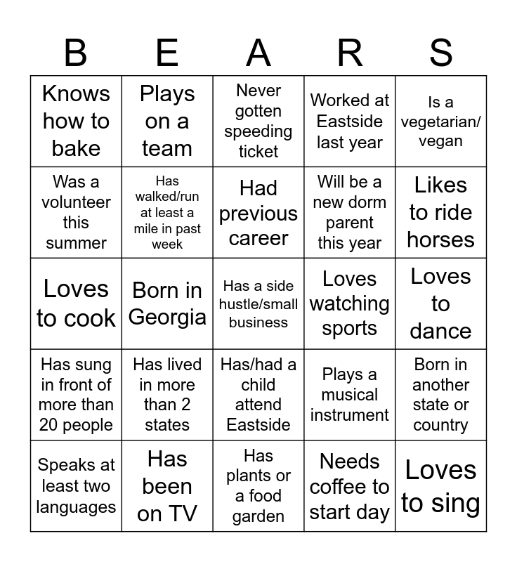 This bingo card has a free space and 34 words: Has 2 or more pets, Needs coffee to start day, Is a night owl, Reads true crime books/watches true crime TV, Has sung in front of more than 20 people, Has walked/run at least a mile in past week, Is a vegetarian/ vegan, Speaks at least two languages, Plays on a team, Worked at another school, Had previous career, Never gotten speeding ticket, Has/had a child attend DCSS school, Plays wordle or nerdle everyday, Loves watching sports, Likes to ride horses, Has been on TV, Loves to cook, Has lived in more than 2 states, Plays a musical instrument, Has/had a child attend Eastside, Has no pets, Knows how to bake, Loves to dance, Has plants or a food garden, Loves to sing, Worked at Eastside last year, Moved this summer, Will be a new dorm parent this year, Was a volunteer this summer, Attended a workshop, Born in Georgia, Born in another state or country and Is taking on a new role at Eastside.