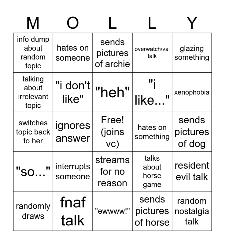 This bingo card has a free space and 24 words: interrupts someone, fnaf talk, "heh", randomly draws, glazing something, info dump about random topic, talking about irrelevant topic, hates on someone, hates on something, streams for no reason, "i like...", switches topic back to her, talks about horse game, resident evil talk, "i don't like", sends pictures of horse, sends pictures of dog, sends pictures of archie, xenophobia, ignores answer, random nostalgia talk, "so...", overwatch/val talk and "ewwww!".