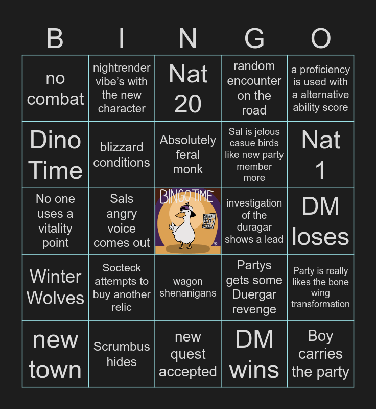 This bingo card has a free space and 24 words: Socteck attempts to buy another relic, Scrumbus hides, Absolutely feral monk, new town, a proficiency is used with a alternative ability score, no combat, Dino Time, nightrender vibe’s with the new character, investigation of the duragar shows a lead, wagon shenanigans, Sal is jelous casue birds like new party member more, No one uses a vitality point, Partys gets some Duergar revenge, Party is really likes the bone wing transformation, blizzard conditions, DM wins, DM loses, Nat 20, Nat 1, Sals angry voice comes out, Boy carries the party, Winter Wolves, random encounter on the road and new quest accepted.
