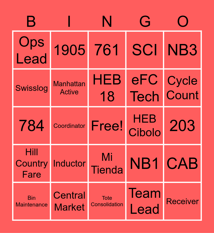 This bingo card has a free space and 49 words: EFC Trainer, Receiver, Autostore Ambient, Tote Consolidation, Inductor, HEB Fresh Tortillas, 1905, Autostore Cooler, Swisslog, Synq, Manhattan Active, SCI, CAB, NB1, Seguin, HEB 26, HEB 18, HEB Cibolo, Kittyhawk, NB3, Coordinator, Team Lead, Ops Lead, eFC Tech, Sanitation, Cycle Count, Bin Maintenance, Blind Receive, Mi Tienda, Hill Country Fare, HEB Organics, H-E-Buddy, Joe V's, Arsenal, Central Market, MWT, 206, 227, 203, 404, Creamy Creation, Cafe Ole, Meal Simple, Texas Backyard BBQ, 784, 761, 766, 788 and Lonestar.