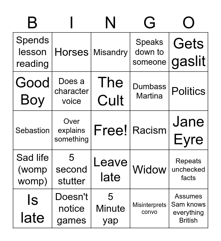 This bingo card has a free space and 24 words: 5 second stutter, Doesn't notice games, The Cult, Is late, Gets gaslit, Spends lesson reading, Good Boy, Horses, Racism, Leave late, Dumbass Martina, Sebastion, Widow, Repeats unchecked facts, Does a character voice, Misinterprets convo, Jane Eyre, Misandry, Politics, Over explains something, Assumes Sam knows everything British, Sad life (womp womp), Speaks down to someone and 5 Minute yap.