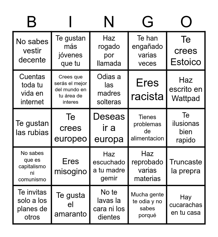 This bingo card has a free space and 24 words: Eres misogino, Te gusta el amaranto, Odias a las madres solteras, Te invitas solo a los planes de otros, Te crees Estoico, No sabes vestir decente, Cuentas toda tu vida en internet, Te gustan más jóvenes que tu, Tienes problemas de alimentacion, Haz escuchado a tu madre gemir, Eres racista, Te gustan las rubias, Haz reprobado varias materias, Truncaste la prepra, Crees que serás el mejor del mundo en tu área de interes, Mucha gente te odia y no sabes porqué, Te ilusionas bien rapido, Haz rogado por llamada, Haz escrito en Wattpad, Te crees europeo, Hay cucarachas en tu casa, No sabes que es capitalismo ni comunismo, Te han engañado varias veces and No te lavas la cara ni los dientes.