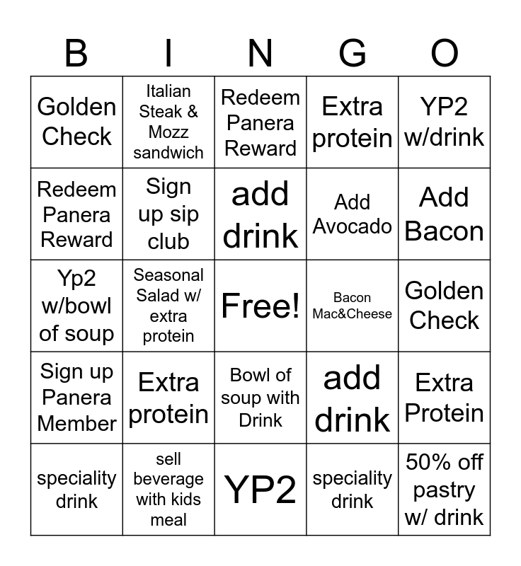 This bingo card has a free space and 24 words: Extra protein, sell beverage with kids meal, add drink, speciality drink, YP2 w/drink, Golden Check, Redeem Panera Reward, Italian Steak & Mozz sandwich, Bacon Mac&Cheese, Bowl of soup with Drink, Add Avocado, Yp2 w/bowl of soup, add drink, Extra Protein, Sign up sip club, speciality drink, Golden Check, Redeem Panera Reward, Add Bacon, Seasonal Salad w/ extra protein, 50% off pastry w/ drink, Sign up Panera Member, Extra protein and YP2.