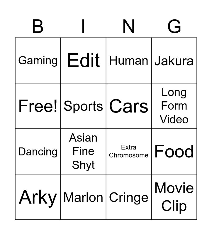This bingo card has 16 words: Marlon, Food, Human, Gaming, Dancing, Edit, Extra Chromosome, Cringe, Free!, Sports, Arky, Jakura, Asian Fine Shyt, Long Form Video, Cars and Movie Clip.