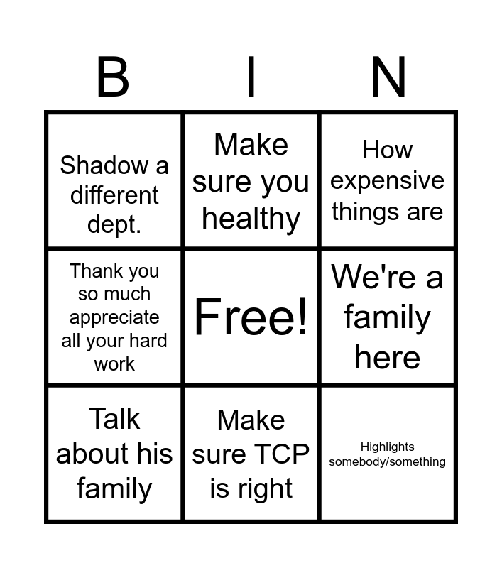 This bingo card has a free space and 8 words: Thank you so much appreciate all your hard work, Make sure you healthy, We're a family here, Talk about his family, How expensive things are, Shadow a different dept., Make sure TCP is right and Highlights somebody/something.