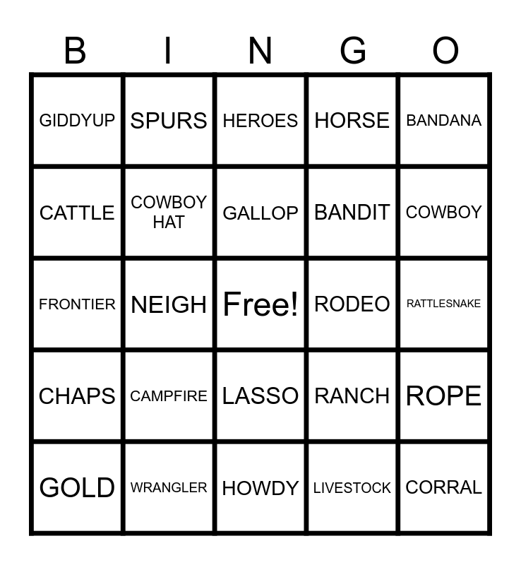 This bingo card has a free space and 29 words: GOLD, BUFFALO, NEIGH, SADDLE, GIDDYUP, HEROES, COWBOY HAT, CAMPFIRE, RODEO, WRANGLER, RATTLESNAKE, CORRAL, HOWDY, LIVESTOCK, COWBOY, ROUNDUP, LASSO, CHAPS, BANDANA, FRONTIER, RANCH, BUNKHOUSE, BANDIT, CATTLE, HORSE, SPURS, ROPE, GALLOP and BRONCO.