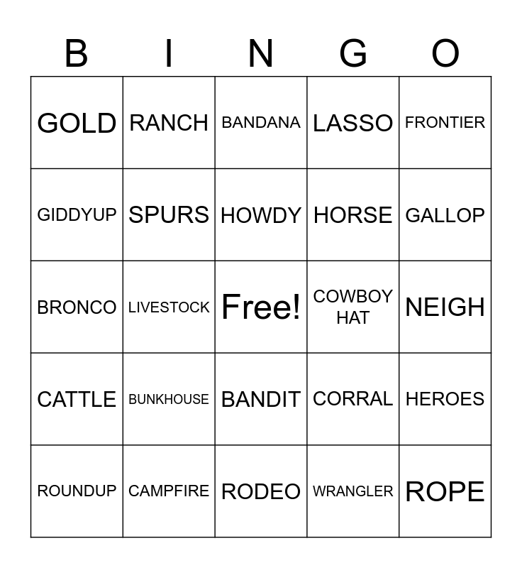This bingo card has a free space and 29 words: ROUNDUP, COWBOY, LIVESTOCK, BUFFALO, GOLD, BANDANA, SPURS, BUNKHOUSE, COWBOY HAT, CAMPFIRE, NEIGH, ROPE, RODEO, WRANGLER, GALLOP, SADDLE, BANDIT, CATTLE, FRONTIER, BRONCO, CORRAL, RATTLESNAKE, HORSE, GIDDYUP, LASSO, RANCH, HEROES, HOWDY and CHAPS.