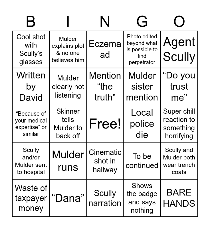 This bingo card has a free space and 83 words: Laugh out loud, Scully cancer mention, Eczema ad, Scully cross necklace, We fill in the next line of dialogue or scene, Disgustingly graphic, Lone Gunman appearance, Not a parking spot, “I have to know”, Mulder sleeps on his couch, Sculder or Mully, Scully wears heels in a dangerous place, Mulder clearly not listening, Local police die, Continuous shot, Cool shot with Scully’s glasses, Waste of taxpayer money, Written by David, Music by Mark Snow, Uggo tie, Callback to previous plotline, Mulder sister mention, BARE HANDS, Answering the phone with “it’s me”, Skinner tells Mulder to back off, Bill Clinton photo, Scully does the autopsy, Monster put in regular jail, No one eats anything the whole episode, Everything is worse than when the episode starts, Mulder runs, Mulder runs through the woods, “I’m a medical doctor”, “Because of your medical expertise” or similar, Scully draws her gun, Mulder draws his gun, Scully narration, Mulder narration, “Do you trust me”, Scully and/or Mulder sent to hospital, Scully and/or Mulder visit hospital, Pendrell ‼️‼️‼️ OR “theory”, Mention of a specific medication, Mulder and Scully split up (WHY!!!), Referral, Time stamp, Mulder explains plot & no one believes him, Mulder abs, Scully wears a skirt, It’s a fit, To be continued, Photo edited beyond what is possible to find perpetrator, Super chill reaction to something horrifying, Scully is the believer, Aliens, Cigarette Man, “Fox”, Spooky Mulder, “Dana”, “I’m a federal agent!!!”, “I have X number of X Files on this”, Skinner in episode, Agent Mulder, Agent Scully, Military-related episode, Scully and Mulder both wear trench coats, More than 10 extras, Episodes begins with the end, Scully abduction mention, Scene in Scully’s apartment, Scene in Mulder’s apartment, Mulder snarky comment, Mulder or Scully go on a date!, Cinematic shot in hallway, Shows the badge and says nothing, Two uggo ties, They should kiss right now, Mention “the truth”, Mulder’s office, Scully in a lab coat, Mulder hangs up first, Specific city in stamp and Pop culture reference.