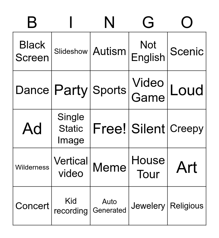 This bingo card has a free space and 24 words: Vertical video, Kid recording, Sports, Concert, Scenic, Black Screen, Dance, Slideshow, Silent, Meme, Video Game, Ad, House Tour, Art, Party, Jewelery, Creepy, Autism, Loud, Single Static Image, Religious, Wilderness, Not English and Auto Generated.