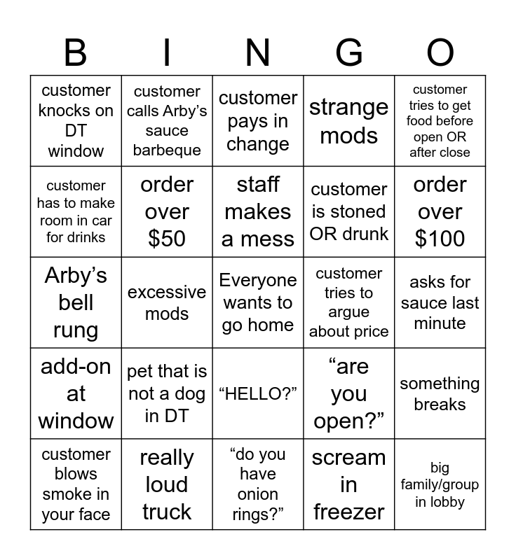 This bingo card has a free space and 40 words: cute dog in DT, Arby’s bell rung, “Uhhhhhhh”, order over $50, really loud truck, “HELLO?”, staff makes a mess, mispronounced menu item, customer tries to get food before open OR after close, add-on at window, excessive mods, strange mods, big family/group in lobby, asks for sauce last minute, customer tries to argue about price, pet that is not a dog in DT, get a tip!, customer knocks on DT window, impatient/rude Doordasher, customer pays in change, something breaks, scream in freezer, customer is stoned OR drunk, customer has to make room in car for drinks, tries to order something from a different restaurant, we run out of an item, “Do you sell bags of ice?”, customer tries to make a joke, it’s not funny, drive-off car, prank call, customer on phone in DT, customer blows smoke in your face, abrupt genre change on someone’s playlist, “are you open?”, order over $100, “do you have onion rings?”, “regular fries”, customer wearing swimsuit and not much else, customer calls Arby’s sauce barbeque and customer tries to bring a dog/pet inside lobby (NOT ALLOWED BTW).