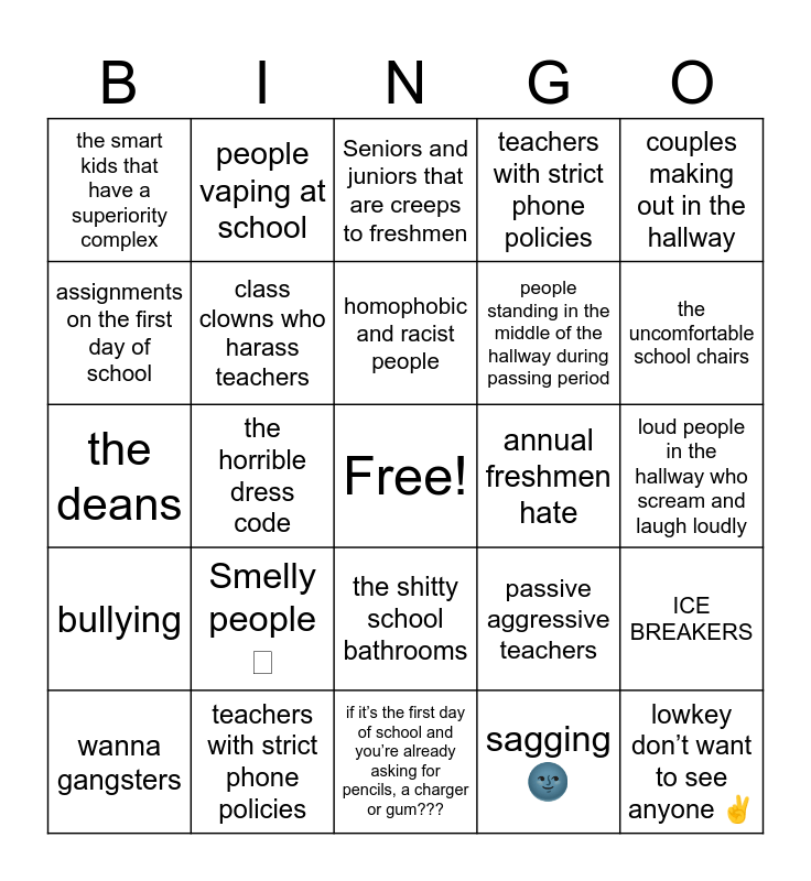 This bingo card has a free space and 24 words: Smelly people , teachers with strict phone policies, homophobic and racist people, wanna gangsters, couples making out in the hallway, the smart kids that have a superiority complex, assignments on the first day of school, people vaping at school, annual freshmen hate, the shitty school bathrooms, people standing in the middle of the hallway during passing period, the deans, passive aggressive teachers, ICE BREAKERS, class clowns who harass teachers, sagging 🌚, loud people in the hallway who scream and laugh loudly, Seniors and juniors that are creeps to freshmen, the uncomfortable school chairs, the horrible dress code, lowkey don’t want to see anyone ✌️, bullying, teachers with strict phone policies and if it’s the first day of school and you’re already asking for pencils, a charger or gum???.
