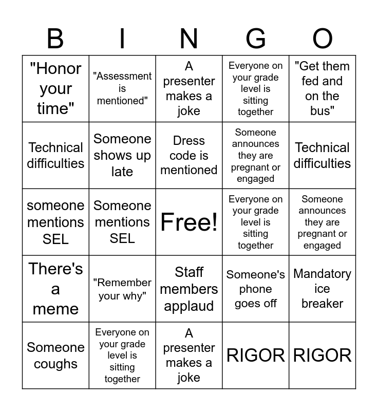 This bingo card has a free space and 81 words: Staff members applaud, someone shows up late, A presenter makes a joke, Mandatory ice breaker, Someone makes a comment that makes you uncomfortable, Someone shows up in a cast or a boot, Title 1 is mentioned, An acronym is used, Someone coughs, RIGOR, Someon's phone goes off, There's a meme, Everyone on your grade level is sitting together, "Honor your time", Someone stands up in the back, Technical difficulties, Data is shown and discussed, "Remember your why", New teachers are forced to stand up, Someone announces they are pregnant or engaged, "Assessment" is mentioned, "Get them fed and on the bus", someone mentions SEL, Dress code is mentioned, Someone shows up late, Someone shows up in a cast or boot, Someone's phone goes off, Mandatory ice breaker, "Remember your why", Dress code is mentioned, Technical difficulties, Title 1 is mentioned, A presenter makes a joke, Someone stands up in the back, Someone coughs, Everyone on your grade level is sitting together, "Get them fed and on the bus", New teachers are forced to stand up, "Honor your time", An acronym is used, RIGOR, Data is shown and discussed, Someone announces they are pregnant or engaged, There's a meme, Someone mentions SEL, Staff members applaud, "Assessment is mentioned", Someone makes a comment that makes you uncomfortable, Someone shows up late, Someone shows up in a cast or boot, Someone's phone goes off, Mandatory ice breaker, "Remember your why", Dress code is mentioned, Technical difficulties, Title 1 is mentioned, A presenter makes a joke, Someone stands up in the back, Someone coughs, Someone mentions SEL, Staff members applaud, "Assessment is mentioned", Someone makes a comment that makes you uncomfortable, Everyone on your grade level is sitting together, "Get them fed and on the bus", New teachers are forced to stand up, "Honor your time", An acronym is used, RIGOR, Data is shown and discussed, Someone announces they are pregnant or engaged, There's a meme, Everyone on your grade level is sitting together, "Get them fed and on the bus", New teachers are forced to stand up, "Honor your time", An acronym is used, RIGOR, Data is shown and discussed, Someone announces they are pregnant or engaged and There's a meme.