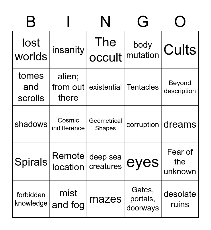 This bingo card has 25 words: Remote location, mazes, existential, forbidden knowledge, Cults, lost worlds, tomes and scrolls, insanity, corruption, deep sea creatures, Tentacles, shadows, eyes, Fear of the unknown, alien; from out there, desolate ruins, dreams, The occult, Beyond description, Cosmic indifference, Geometrical Shapes, mist and fog, Spirals, body mutation and Gates, portals, doorways.