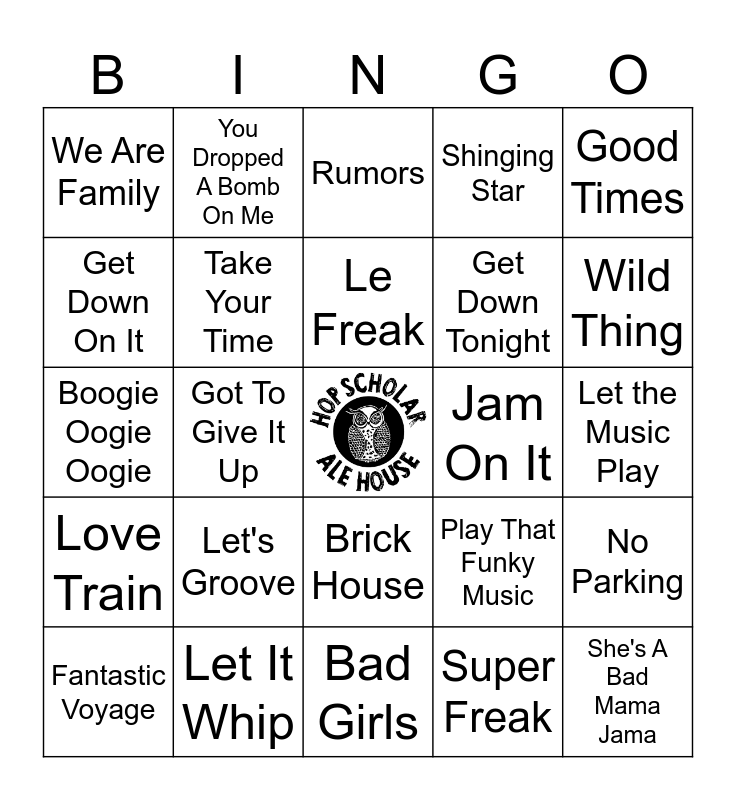 This bingo card has a free space and 24 words: Let's Groove, Let It Whip, Le Freak, Fantastic Voyage, Good Times, We Are Family, Get Down On It, You Dropped A Bomb On Me, Jam On It, Brick House, Get Down Tonight, Boogie Oogie Oogie, Play That Funky Music, No Parking, Take Your Time, Super Freak, Let the Music Play, Rumors, Wild Thing, Got To Give It Up, She's A Bad Mama Jama, Love Train, Shinging Star and Bad Girls.