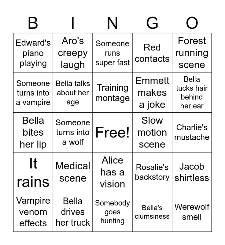 This bingo card has a free space and 24 words: Medical scene, Bella drives her truck, Training montage, Vampire venom effects, Forest running scene, Edward's piano playing, Someone turns into a vampire, Aro's creepy laugh, Slow motion scene, Alice has a vision, Emmett makes a joke, Bella bites her lip, Rosalie's backstory, Jacob shirtless, Bella talks about her age, Bella's clumsiness, Charlie's mustache, Someone runs super fast, Bella tucks hair behind her ear, Someone turns into a wolf, Werewolf smell, It rains, Red contacts and Somebody goes hunting.