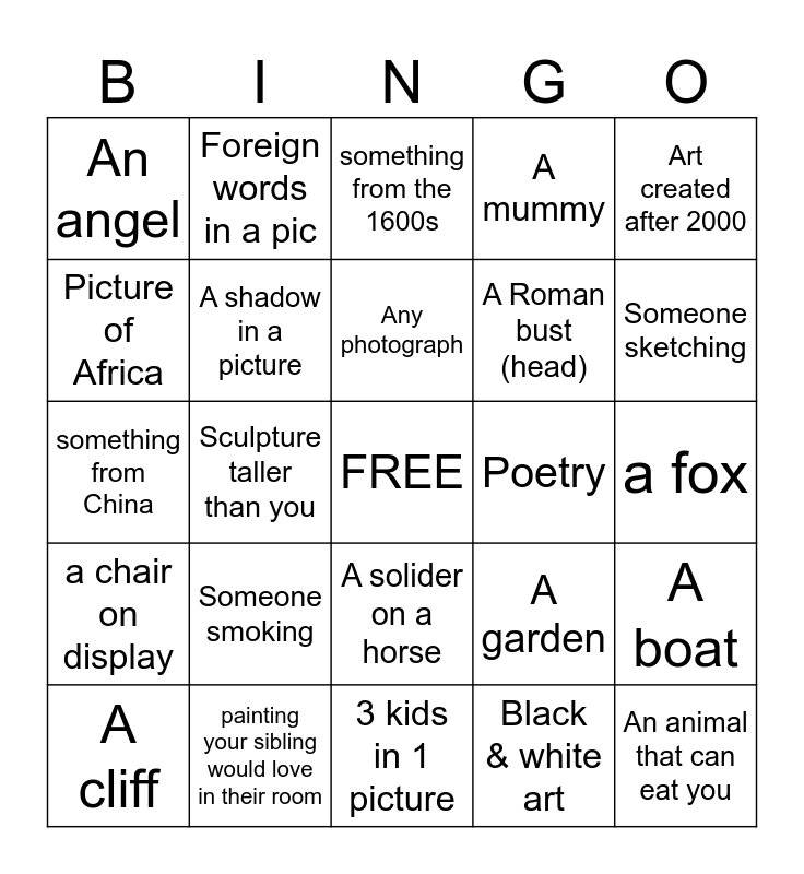 This bingo card has a free space and 49 words: 2 skulls in 1 pic, An animal that can eat you, skyscraper, 3 kids in 1 picture, Someone smoking, A painting from the 1800s, Foreign words in a pic, Model of a boat, Picture of Africa, Picture of Italy, A shadow in a picture, A mummy, A boat, A garden, Flowers, A musical instrument, Any photograph, Poetry, Art you could wear, Art created after 2000, Sculpture taller than you, Black & white art, An angel, A Roman bust (head), A different language, Someone sketching, A cliff, An umbrella, A solider on a horse, a chair on display, a basket on display, three hats in one pic, clouds, someone sleeping, painting your sibling would love in their room, something that gives Dad happy tears, a meal on a table, something made from cardboard, a fox, waterfall, jester, ocean, Bible story, movie or TV playing live, something from China, something from the 1600s, kids playing a game, doctor and laughing child.