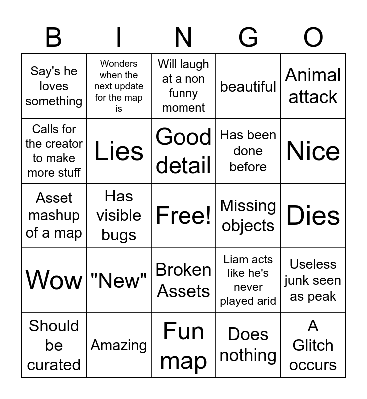 This bingo card has a free space and 24 words: "New", Amazing, Good detail, Should be curated, Animal attack, Say's he loves something, Calls for the creator to make more stuff, Wonders when the next update for the map is, Missing objects, Broken Assets, Has been done before, Asset mashup of a map, Liam acts like he's never played arid, Useless junk seen as peak, Lies, Does nothing, Dies, Will laugh at a non funny moment, Nice, Has visible bugs, A Glitch occurs, Wow, beautiful and Fun map.