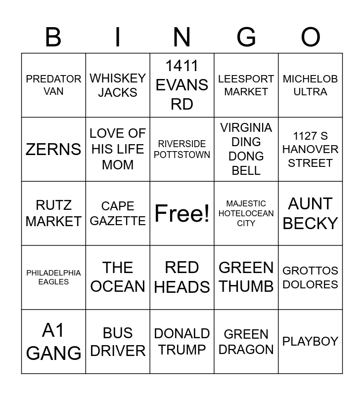 This bingo card has a free space and 24 words: A1 GANG, THE OCEAN, RIVERSIDE POTTSTOWN, GREEN DRAGON, MICHELOB ULTRA, PREDATOR VAN, WHISKEY JACKS, 1411 EVANS RD, MAJESTIC HOTELOCEAN CITY, AUNT BECKY, RUTZ MARKET, LOVE OF HIS LIFE MOM, GREEN THUMB, GROTTOS DOLORES, ZERNS, BUS DRIVER, DONALD TRUMP, LEESPORT MARKET, 1127 S HANOVER STREET, PHILADELPHIA EAGLES, CAPE GAZETTE, RED HEADS, VIRGINIA DING DONG BELL and PLAYBOY.