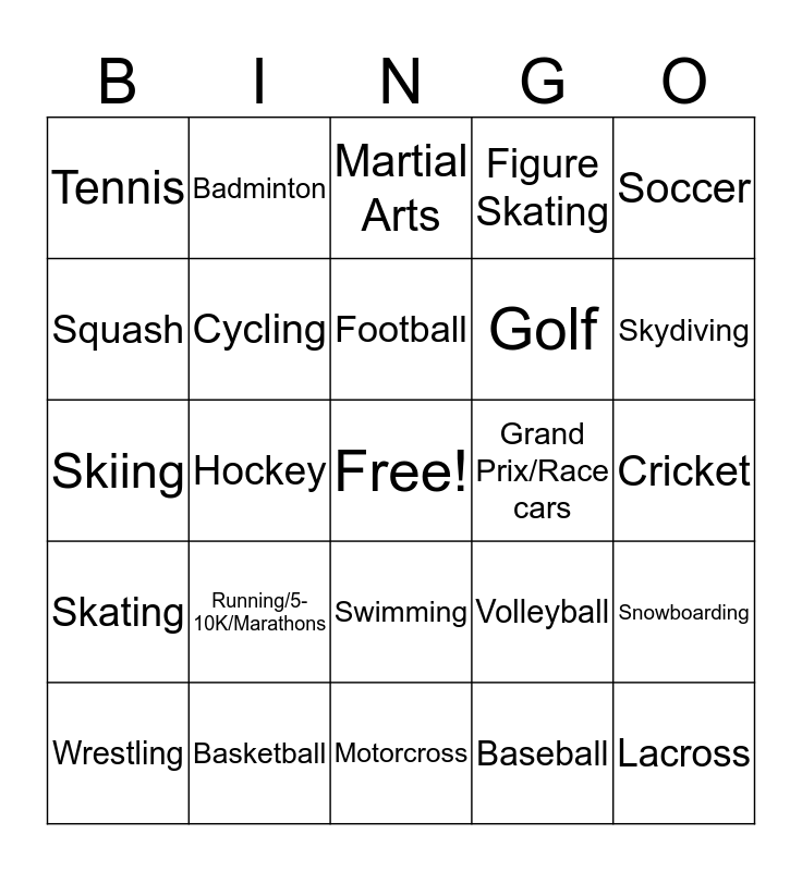 This bingo card has a free space and 26 words: Swimming, Baseball, Football, Basketball, Soccer, Tennis, Squash, Badminton, Cricket, Volleyball, Golf, Skiing, Snowboarding, Wrestling, Hockey, Rugby, Figure Skating, Skating, Martial Arts, Lacross, Skydiving, Motorcross, Grand Prix/Race cars, Running/5-10K/Marathons, Cycling and Gymnastics.