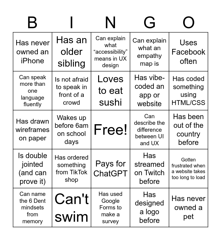 This bingo card has a free space and 24 words: Can name the 6 Dent mindsets from memory, Has ordered something from TikTok shop, Loves to eat sushi, Has designed a logo before, Uses Facebook often, Has never owned an iPhone, Has an older sibling, Can explain what “accessibility” means in UX design, Can describe the difference between UI and UX, Has been out of the country before, Has drawn wireframes on paper, Is not afraid to speak in front of a crowd, Has streamed on Twitch before, Gotten frustrated when a website takes too long to load, Can speak more than one language fluently, Can't swim, Has used Google Forms to make a survey, Can explain what an empathy map is, Has coded something using HTML/CSS, Is double jointed (and can prove it), Wakes up before 6am on school days, Pays for ChatGPT, Has vibe-coded an app or website and Has never owned a pet.