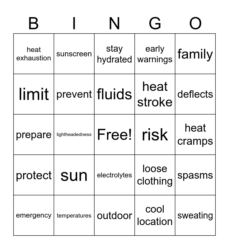 This bingo card has a free space and 24 words: sun, temperatures, fluids, emergency, family, heat exhaustion, limit, sunscreen, risk, electrolytes, heat stroke, prepare, loose clothing, spasms, prevent, cool location, heat cramps, stay hydrated, deflects, lightheadedness, sweating, protect, early warnings and outdoor.