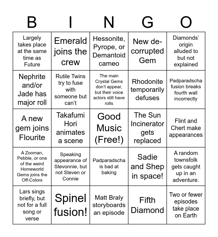 This bingo card has a free space and 24 words: Speaking appearance of Stevonnie, but not Steven or Connie, Spinel fusion!, The main Crystal Gems don’t appear, but their voice actors still have rolls, Lars sings briefly, but not for a full song or verse, Diamonds’ origin alluded to but not explained, Largely takes place at the same time as Future, Nephrite and/or Jade has major roll, Emerald joins the crew, The Sun Incinerator gets replaced, Padparadscha is bad at baking, Rhodonite temporarily defuses, A new gem joins Flourite, Sadie and Shep in space!, A random townsfolk gets caught up in an adventure., Rutile Twins try to fuse with someone but can’t, Fifth Diamond, Flint and Chert make appearances, Hessonite, Pyrope, or Demantoid cameo, Padparadscha fusion breaks fourth wall incorrectly, Takafumi Hori animates a scene, Two or fewer episodes take place on Earth, A Zooman, Pebble, or one of the weird Homeworld Gems joins the Off-Colors, New de-corrupted Gem and Matt Braly storyboards an episode.