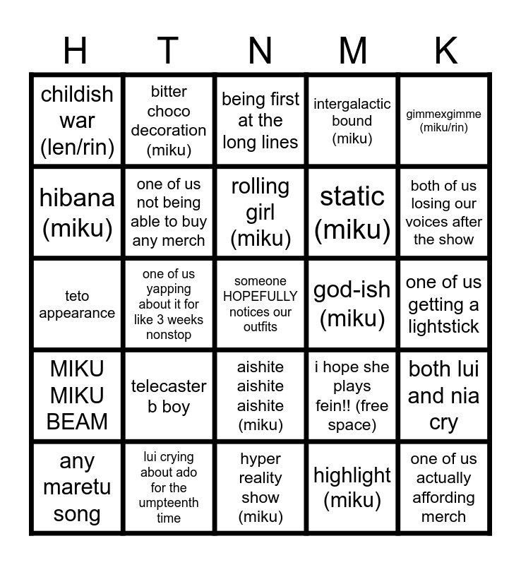 This bingo card has 25 words: telecaster b boy, hyper reality show (miku), rolling girl (miku), any maretu song, gimmexgimme (miku/rin), childish war (len/rin), hibana (miku), bitter choco decoration (miku), god-ish (miku), aishite aishite aishite (miku), static (miku), teto appearance, i hope she plays fein!! (free space), both lui and nia cry, one of us not being able to buy any merch, one of us actually affording merch, one of us getting a lightstick, being first at the long lines, both of us losing our voices after the show, one of us yapping about it for like 3 weeks nonstop, someone HOPEFULLY notices our outfits, lui crying about ado for the umpteenth time, MIKU MIKU BEAM, intergalactic bound (miku) and highlight (miku).