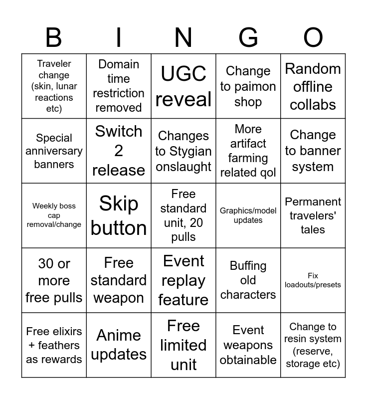 This bingo card has a free space and 24 words: Free standard weapon, Anime updates, Changes to Stygian onslaught, Free elixirs + feathers as rewards, Random offline collabs, Traveler change (skin, lunar reactions etc), Special anniversary banners, Domain time restriction removed, Graphics/model updates, Event replay feature, More artifact farming related qol, Weekly boss cap removal/change, Buffing old characters, Fix loadouts/presets, Switch 2 release, Event weapons obtainable, Permanent travelers' tales, UGC reveal, Change to banner system, Skip button, Change to resin system (reserve, storage etc), 30 or more free pulls, Change to paimon shop and Free limited unit.