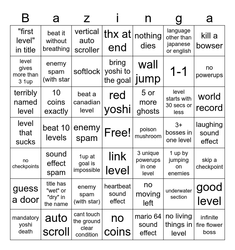 This bingo card has a free space and 48 words: no moving left, 1-1, no coins, beat 10 levels, beat a canadian level, laughing sound effect, beat it without breathing, auto scroll, language other than japanese or english, link level, kill a bowser, thx at end, level starts with 30 secs or less, 5 or more ghosts, guess a door, 3+ bosses in one level, level gives more than 3 1up, no powerups, underwater section, nothing dies, wall jump, enemy spam, "first level" in title, enemy spam (with star, good level, softlock, world record, mandatory yoshi death, red yoshi, 10 coins exactly, no living things in level, poison mushroom, skip a checkpoint, title has "wet" or "dry" in the name, level that sucks, 3 unique powerups in one level, 1 up by jumping on enemies, terribly named level, 1up at goal is impossible, enemy spam (with star), no checkpoints, infinite fire flower boss, vertical auto scroller, cant touch the ground clear condition, bring yoshi to the goal, heartbeat sound effect, sound effect spam and mario 64 sound effect.
