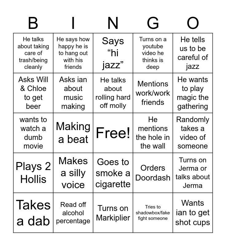This bingo card has a free space and 24 words: Makes a silly voice, Read off alcohol percentage, He talks about rolling hard off molly, Takes a dab, He tells us to be careful of jazz, He talks about taking care of trash/being cleanly, Asks Will & Chloe to get beer, He says how happy he is to hang out with his friends, He mentions the hole in the wall, Goes to smoke a cigarette, Mentions work/work friends, wants to watch a dumb movie, Orders Doordash, Turns on Jerma or talks about Jerma, Asks ian about music making, Tries to shadowbox/fake fight someone, Randomly takes a video of someone, Says “hi jazz”, He wants to play magic the gathering, Making a beat, Wants ian to get shot cups, Plays 2 Hollis, Turns on a youtube video he thinks is deep and Turns on Markiplier.